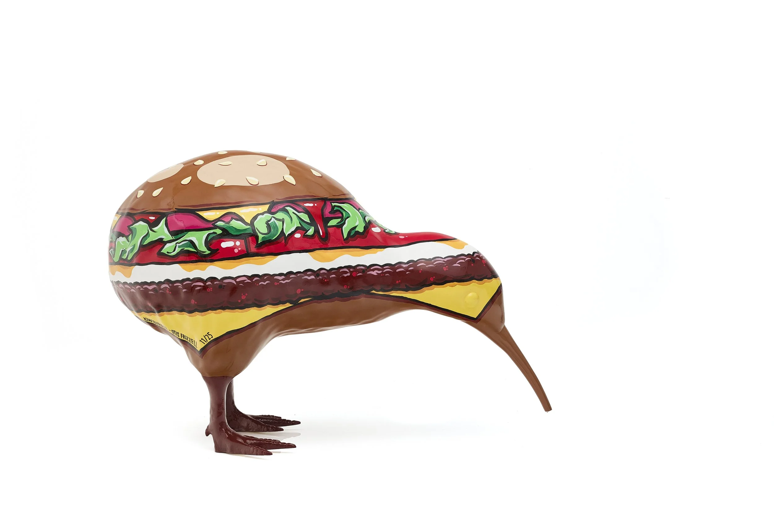 This year was no different. I was thinking of times the word ‘kiwi’ has been used in Aotearoa Pop Culture, and thought of the famous McDonald’s Kiwi Burger. So…. The idea was, to turn this year’s Kiwi into a giant Kiwi Burger. Complete with… (from top to bottom) A sesame seed bun, tomato sauce and mustard, beetroot, lettuce, tomato, egg, meat patty, cheese and the bottom bun. All painted in a funky, bold and Pop Art style.