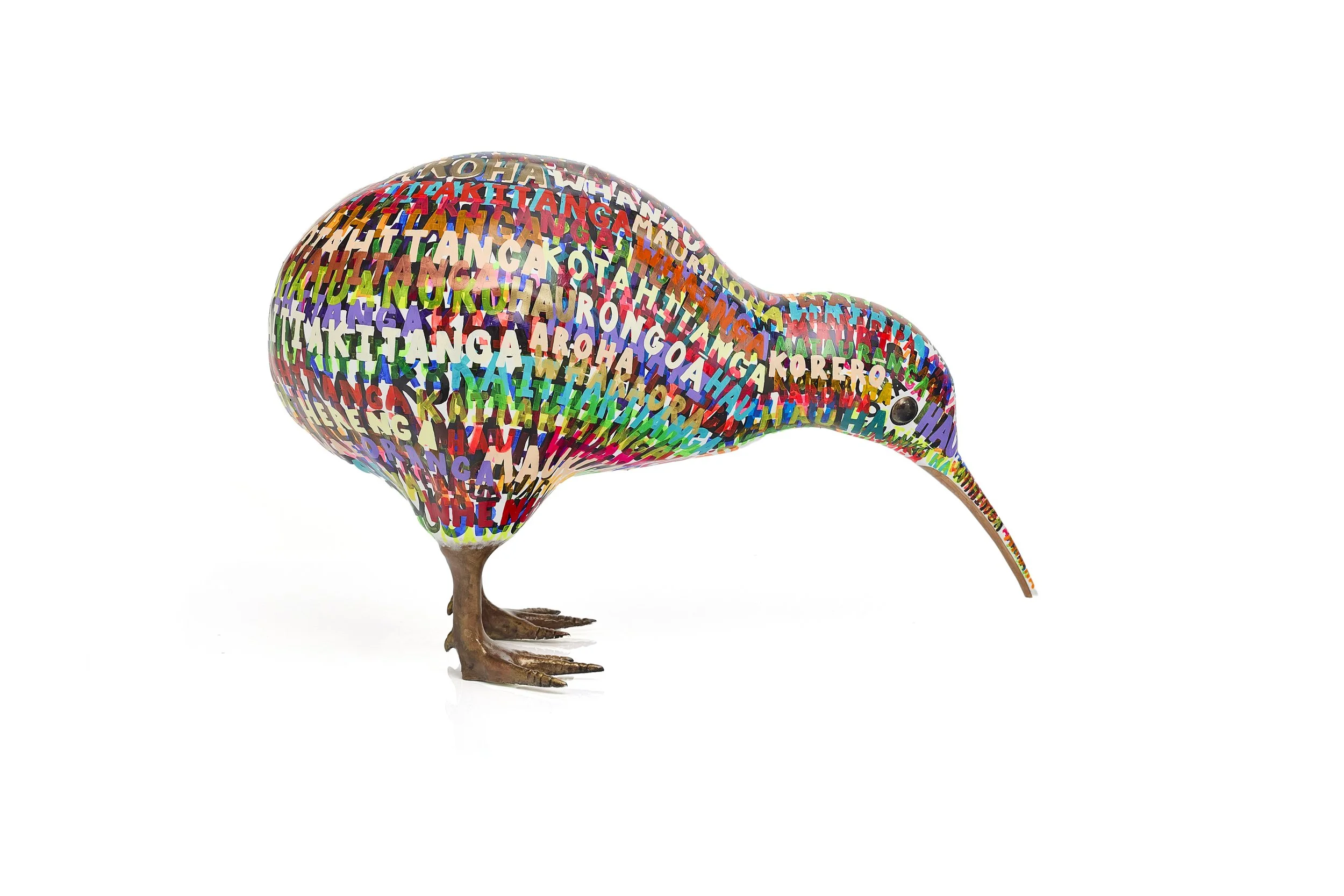 He Reo mō te Kiwi (A voice for the kiwi) is a sculptural work that gives voice to an endangered taonga species through layered language and colour. Painted entirely with te reo Māori kupu, the kiwi’s form becomes a vessel of meaning, carrying values of guardianship, love, healing, breath, and life force. The words are not presented as explanations, but as texture and rhythm, encouraging close looking and quiet discovery. Through this work, the protection of the kiwi and the preservation of language are held as inseparable acts of care, reminding us that what we choose to safeguard—whether species, culture, or land—shapes the wellbeing of future generations.